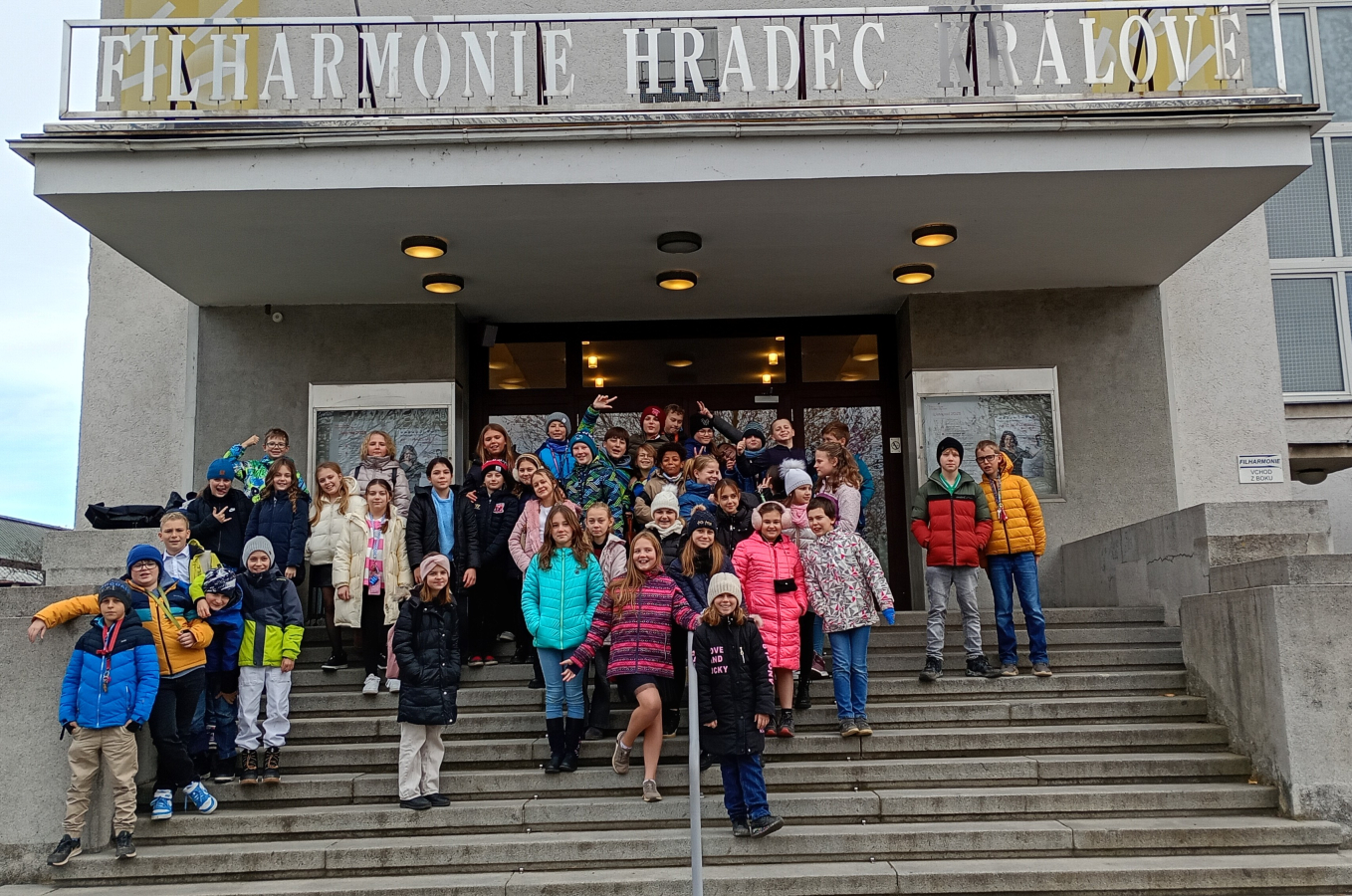 V pátek 21. listopadu 2025 vyjeli žáci 5. tříd do Filharmonie Hradec Králové. V sále Soni Červené zhlédli speciální hudební vystoupení s názvem 800 let Hradce Králové. Sledovali, jak dva žáci cestují historií města. Viděli divadelní vystoupení spojené s rokem 1225, kdy město Hradec Králové založil Přemysl Otakar I., dále s královnu Elišku Rejčku, husity, ale i třídu s učitelem Václavem Klimentem Klicperou a jeho žáky (Erbenem a Tylem) a starostu Ulricha, který se chystal oslovit Gočára s Kotěrou,