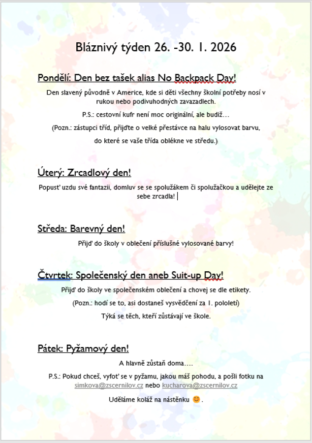 Na naší škole proběhl tematický týden plný barev, kreativity a zábavy. Zažili jsme bláznivé účesy, originální „tašky“ místo batohů, fandění ve sportovních dresech, barevný den i páteční svět naruby. Celý týden spojil žáky napříč ročníky a přinesl spoustu úsměvů! Více zde: https://www.zscernilov.